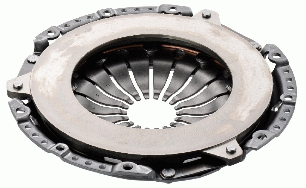 Tryckplattan överför kraften från motorn till växellådan via kopplingslamellen. I moderna motorer används solfjäderkoppling.