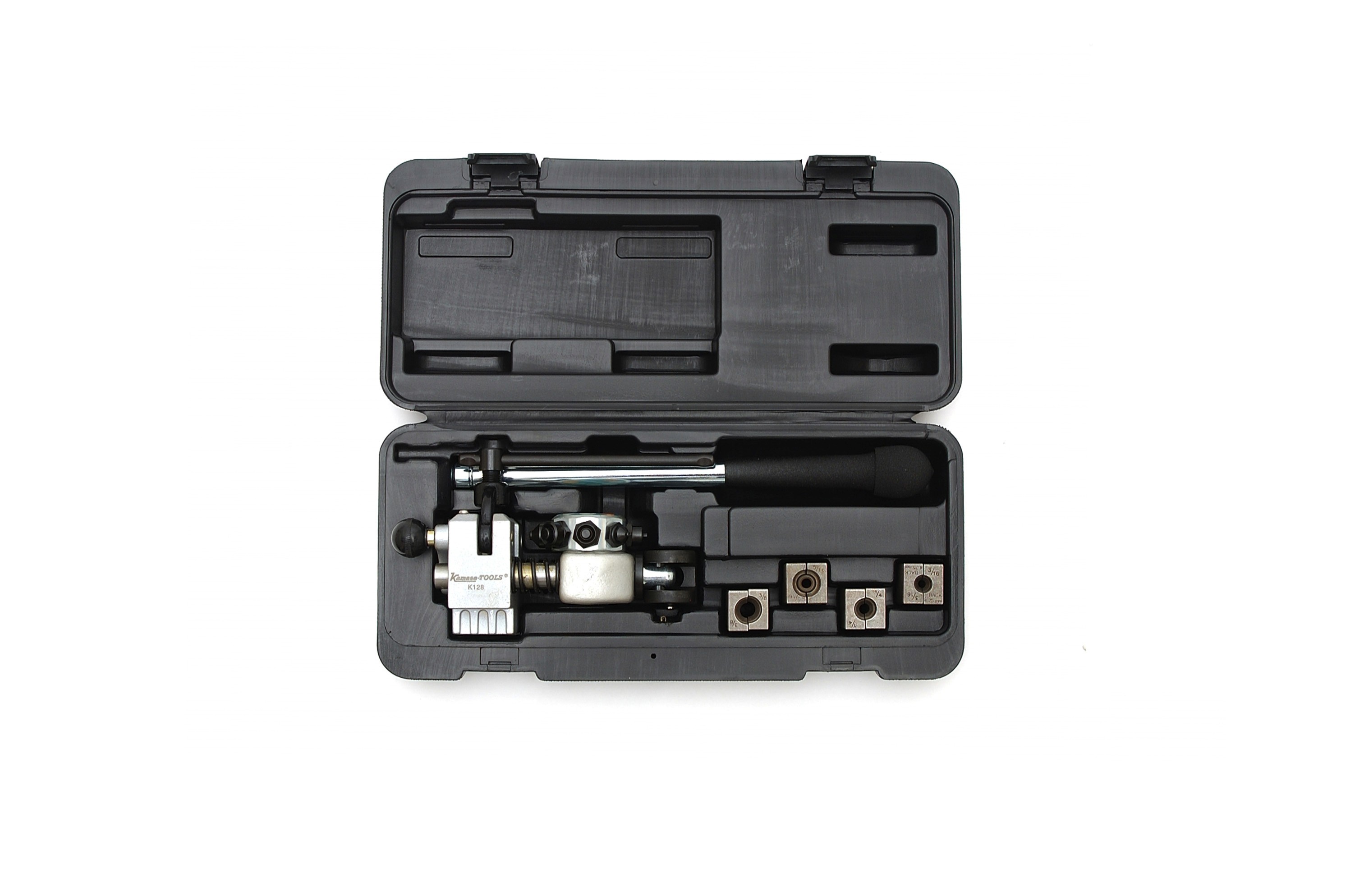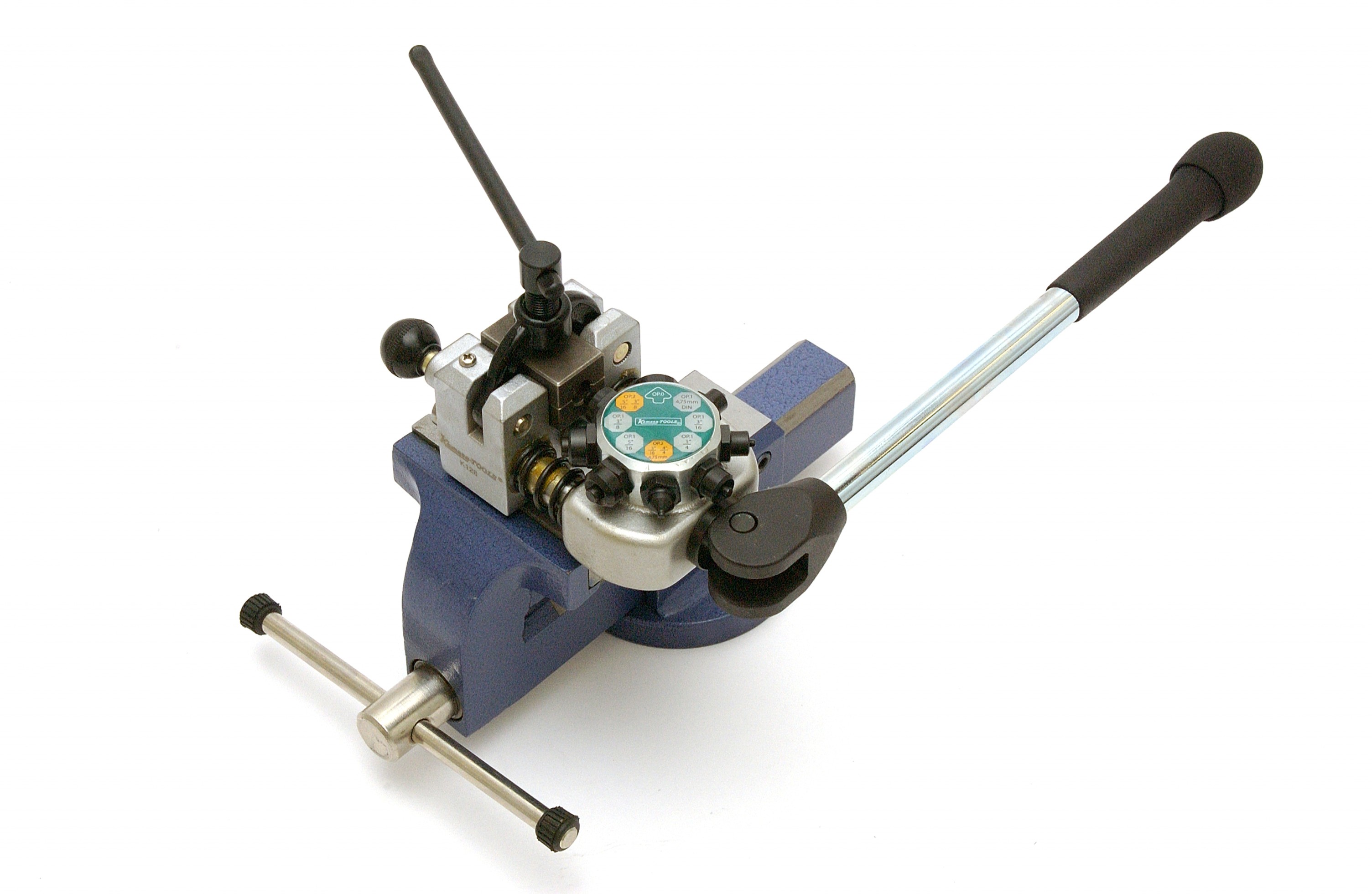 Smidigt verktyg som kläms fast i ett skruvstäd. För enkel och dubbel koning. Komplett sats i plastlåda för rördimentioner: 4,75 mm, 3/16", 1/4", 5/16", 3/8".